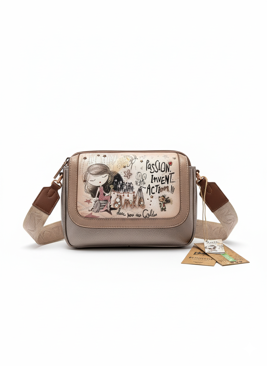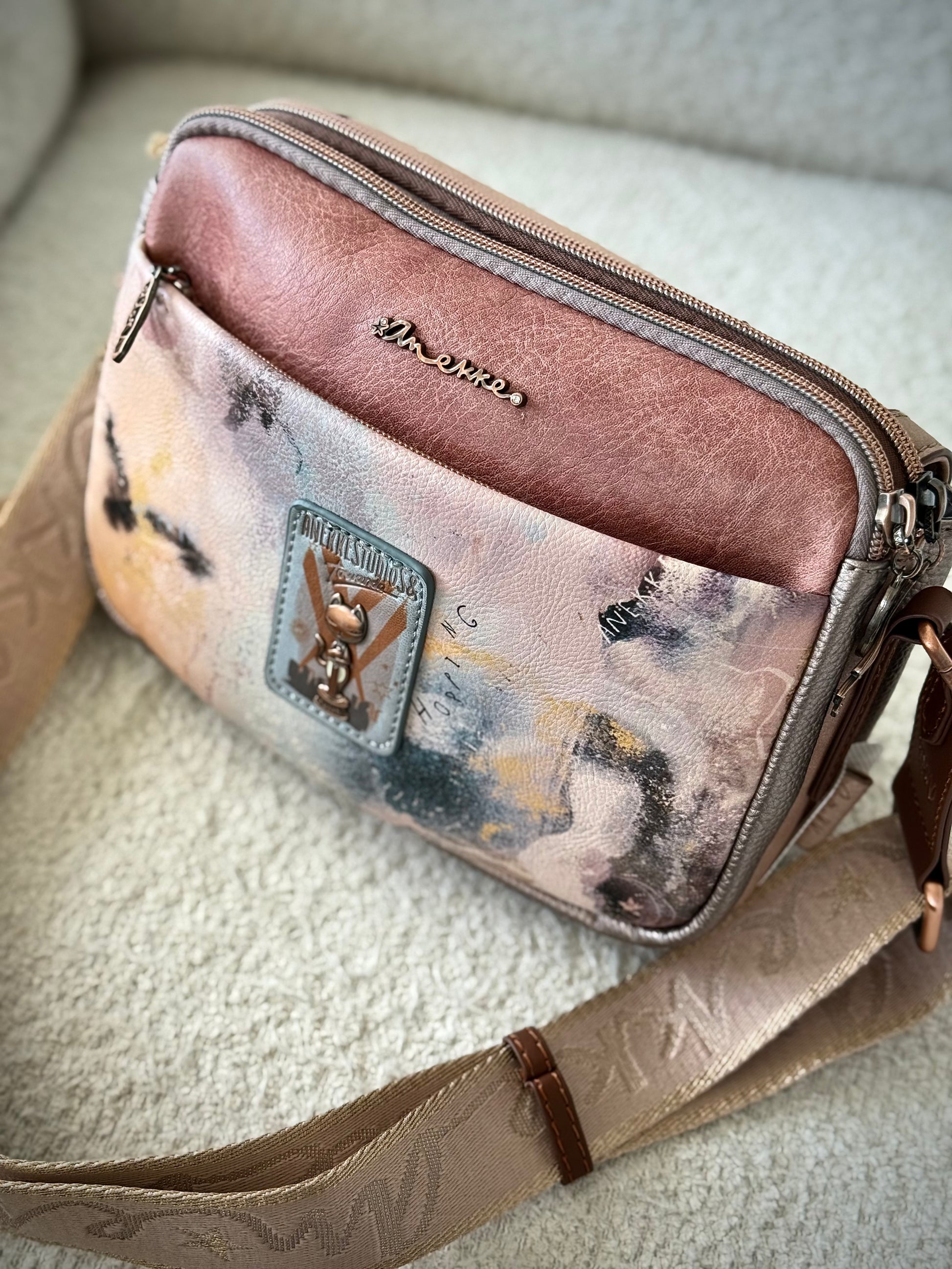Un bolso bandolera Anekke con personalidad: mezcla delicados tonos beige y rosa con una ilustración femenina llena de detalles (aplicaciones en relieve y pequeños brillos) que cuenta una historia de creatividad y pasión. Compacto pero funcional, tiene cierre superior con cremallera, forro interior con compartimentos para organizar lo esencial y una correa ancha ajustable que garantiza comodidad al llevarlo al hombro o cruzado. Perfecto para quien busca un accesorio romántico y urbano.