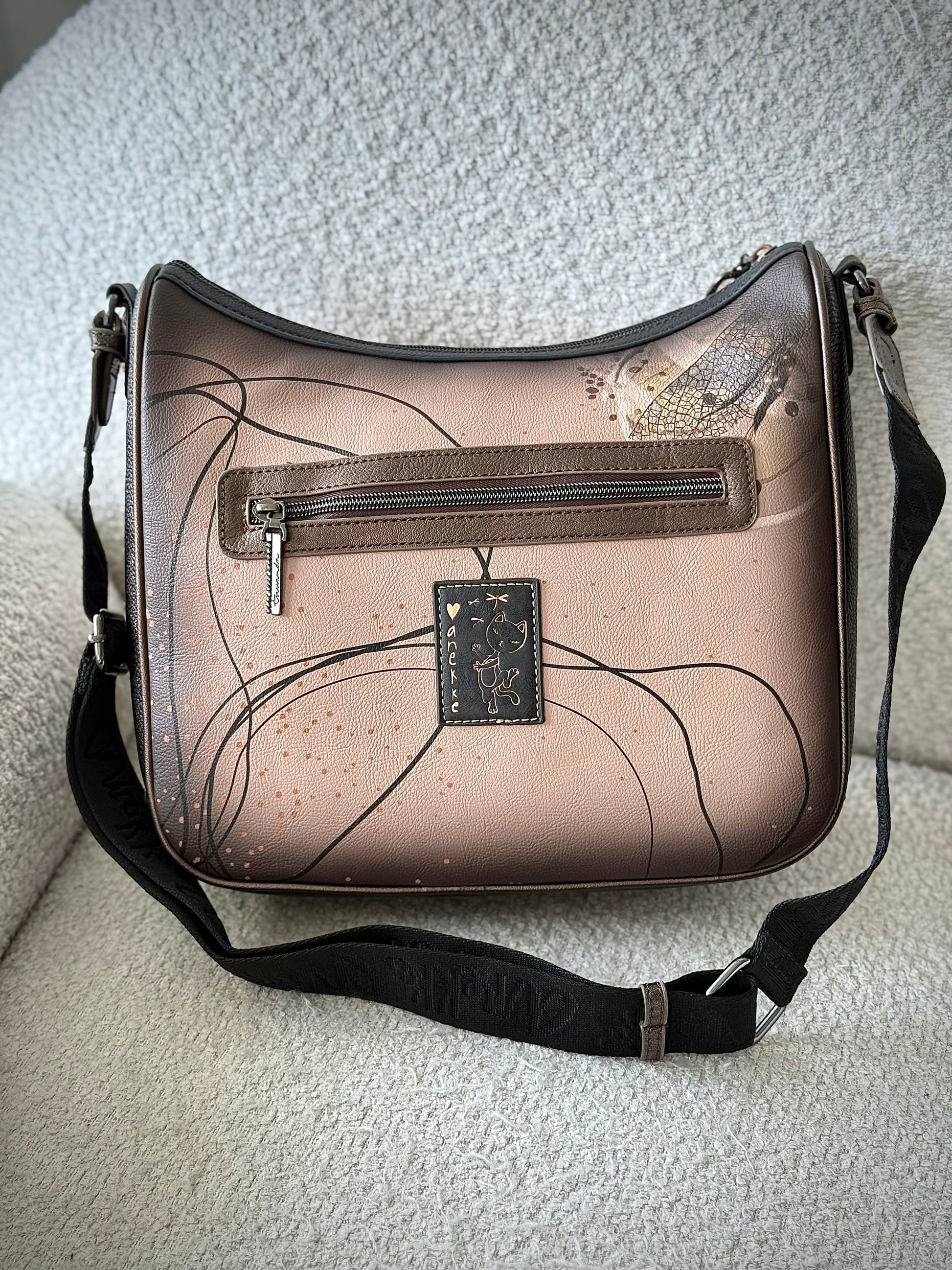 Bolso bandolera con personalidad artística: panel frontal pintado en tonos cálidos, aplicaciones y detalles en relieve, y correa ancha para un uso cómodo y urbano.