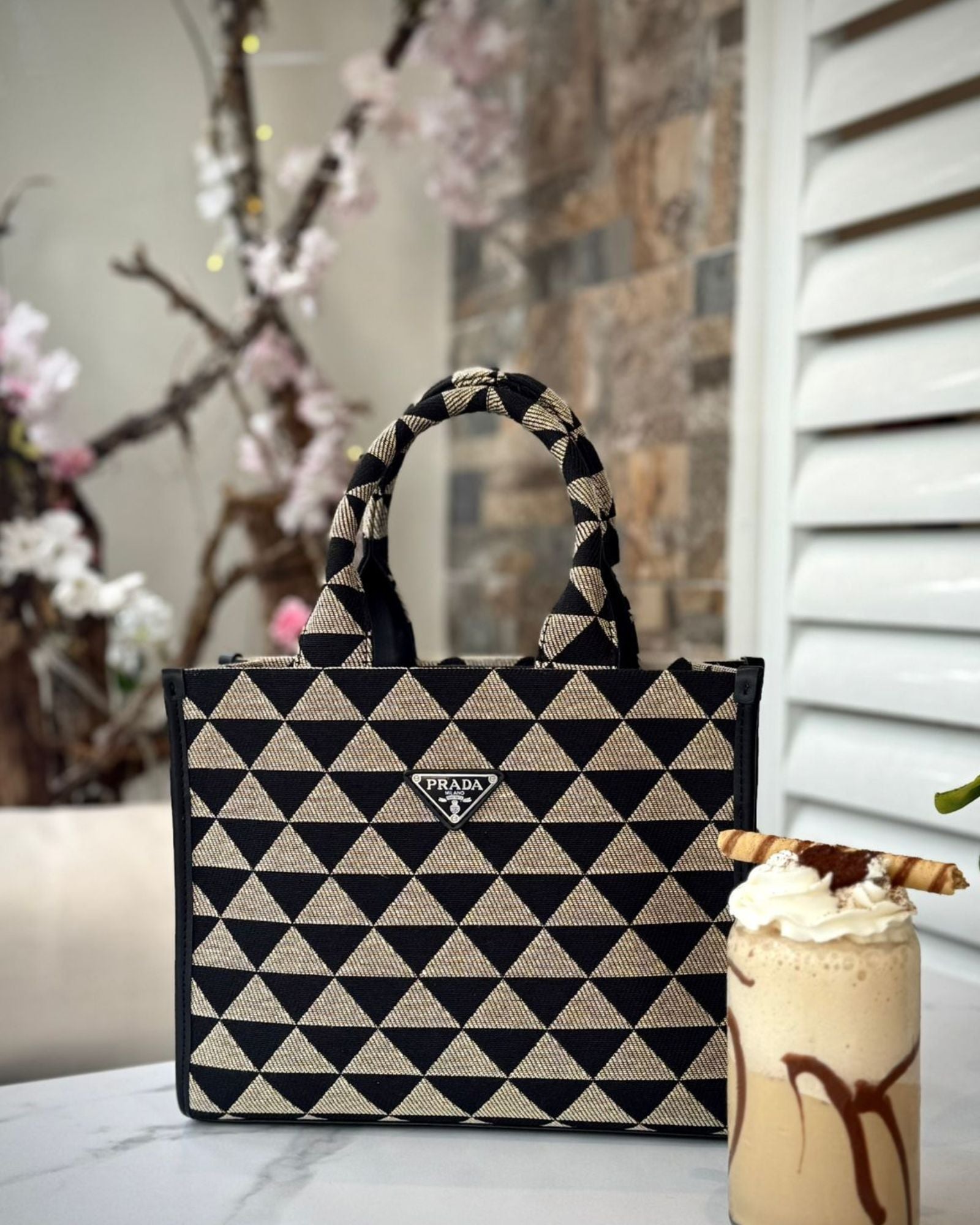 Este elegante bolso destaca por su diseño sofisticado y moderno. Confeccionado en lona de alta calidad, luce un estampado de triángulos en tonos negro y beige , Este bolso tipo tote es estructurada, ideal para llevar tanto en el día a día como en ocasiones especiales.