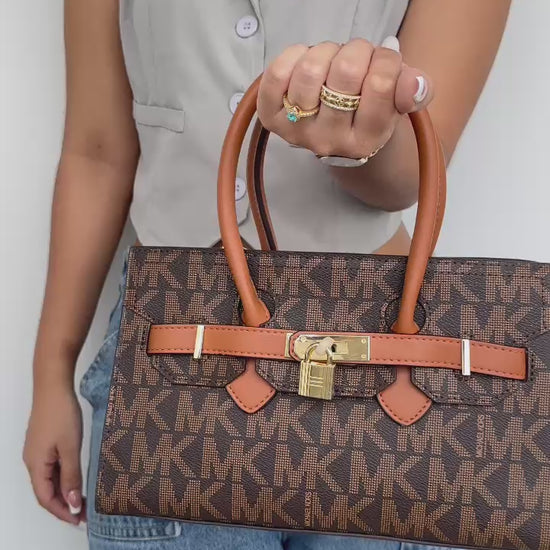 Cartera de la temporada elaborada en material sintético color beige y cafe, estampado monograma, asas planas, cremallera superior y charm metálico.